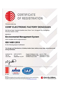 COMFORTABLE ELECTRONIC CO., LTD. was founded in 1972, and specializes in the production of the Battery Holders, Waterproof Battery Holders, Battery Snaps, Metal Contacts and Wire Harnesses. Head office is located in New Taipei City, Taiwan, with an international sales and distribution office in Hong Kong. Manufacturing facilities are located in Taiwan and mainland China. Our main markets are in North America, Europe and OEM production facilities in China. Comf is ISO 9001:2015 and ISO 14001:2015 certified, UL764 Wiring Harnesses, CSA INFORMS Wiring Harnesses No. 2, and all Comf Products are RoHS and REACH compliant.